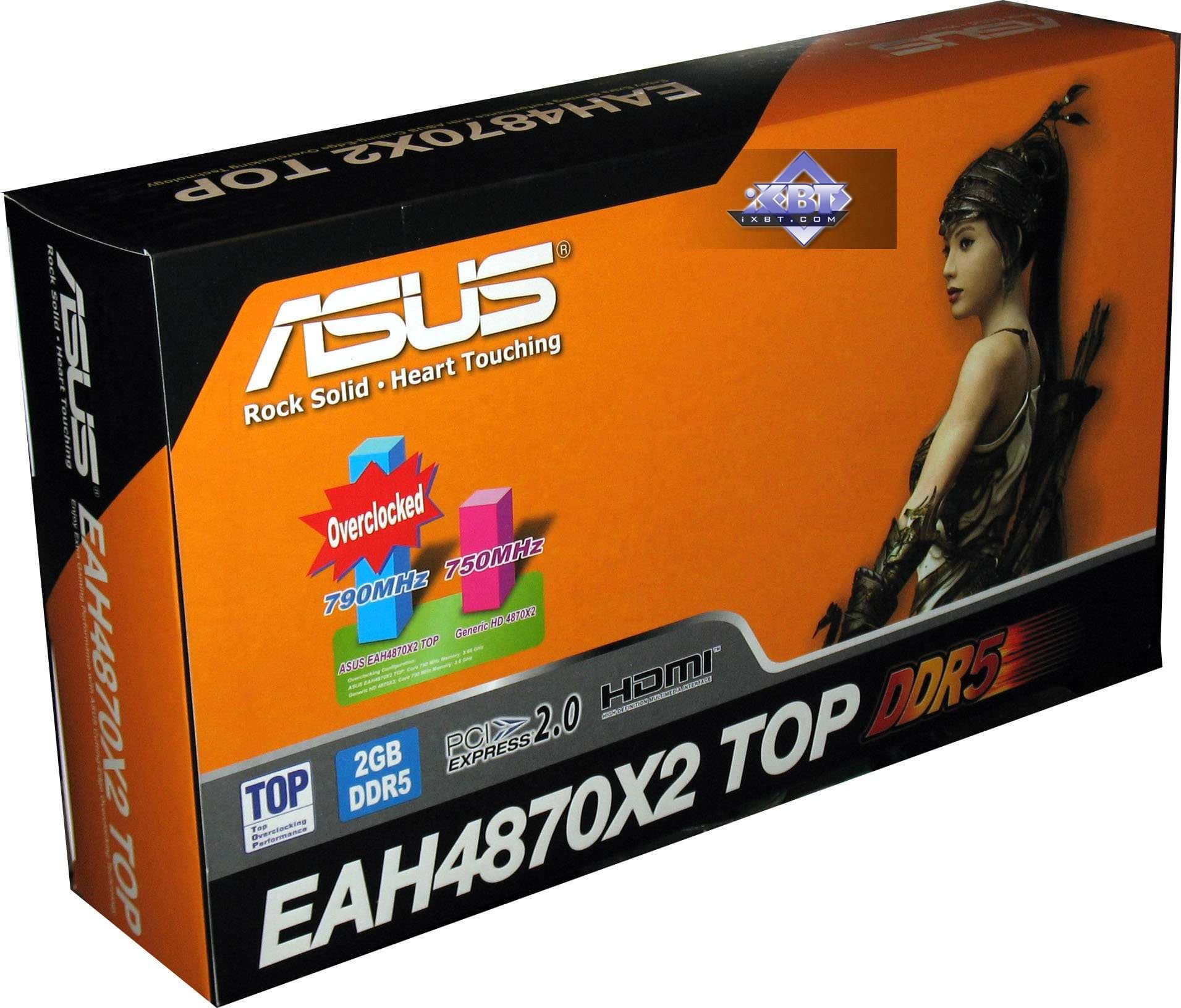 Asus EAH4870X2 TOP (RADEON HD 4870 X2) 2x1024MB PCI-E — по сути, референс-карта, работающая на повышенных частотах. Все минусы референса а плане перегрева — присущи и данному решению. На наш взгляд, для ТОР-решения следовало бы оснастить карту более эффективным кулером. В остальном — все будет решать цена.