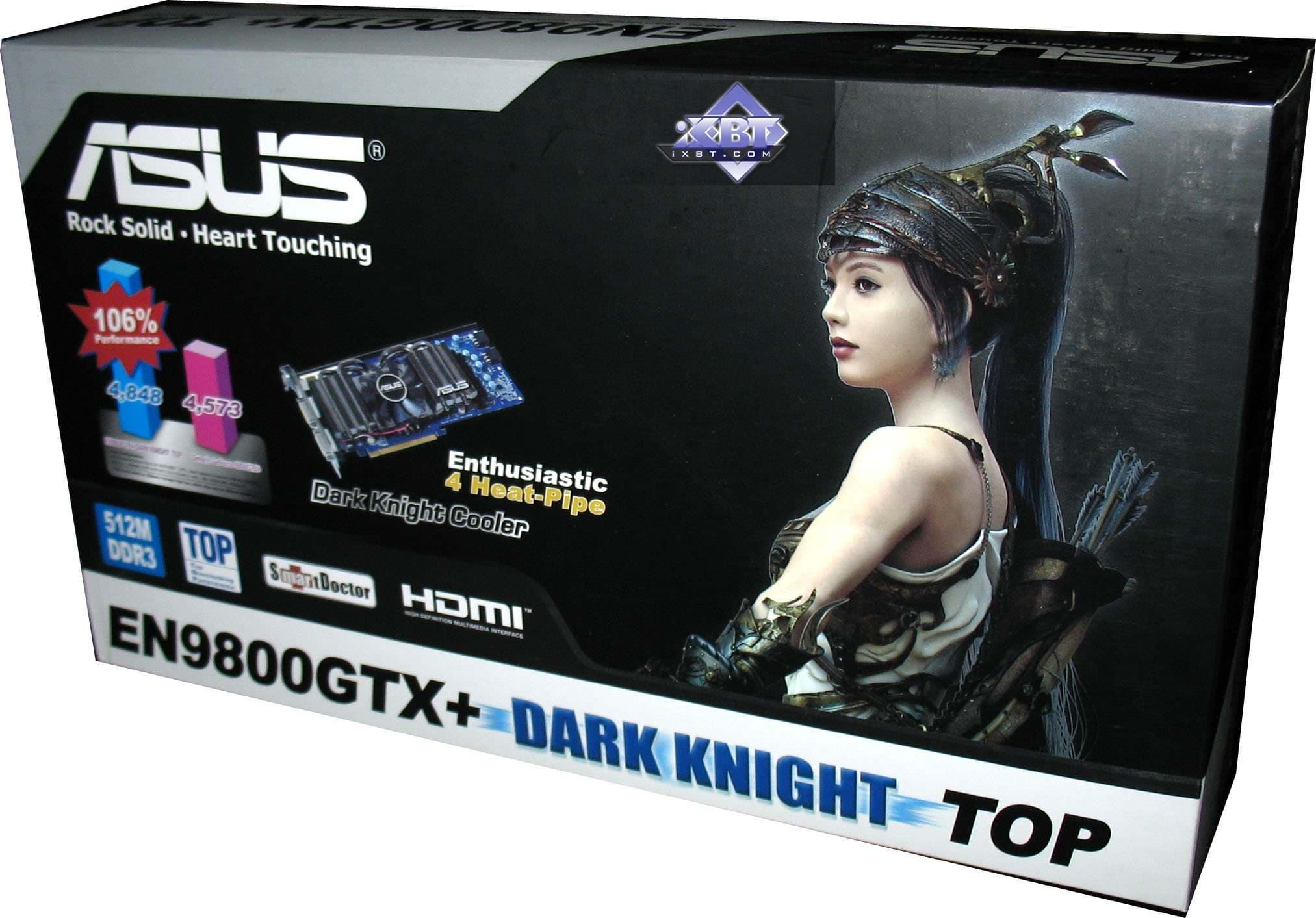 Asus EN9800GTX+ DARK KNIGHT TOP (Geforce 9800GTX+) 512MB PCI-E — очень удачный продукт в плане производительности, обходит соперника по всем фронтам, однако надо следить за ценой, чтобы она не была заметно выше, чем у RADEON HD 4850. Несмотря на менее удачное, чем референс, решение в плане конструкции кулера (нет полноценного выброса всего горячего воздуха, нет охлаждения микросхем памяти), СО работает очень эффективно и бесшумно.