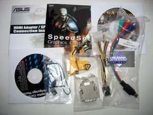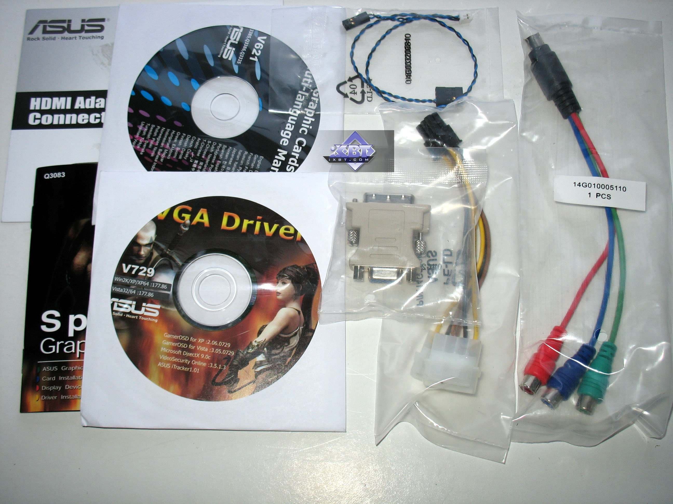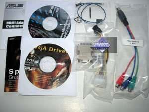 Базовый комплект поставки должен включать в себя: руководство пользователя, диск с драйверами и утилитами, переходник-адаптер DVI-to-VGA, DVI-to-HMDI адаптер (кроме 9800 GT), адаптер компонентного вывода (TV-out), аудио-шнурок для вывода на HDMI (для Geforce-карт), а также разветвители внешнего питания. Далее мы покажем, что предлагается к каждой карте дополнительно.