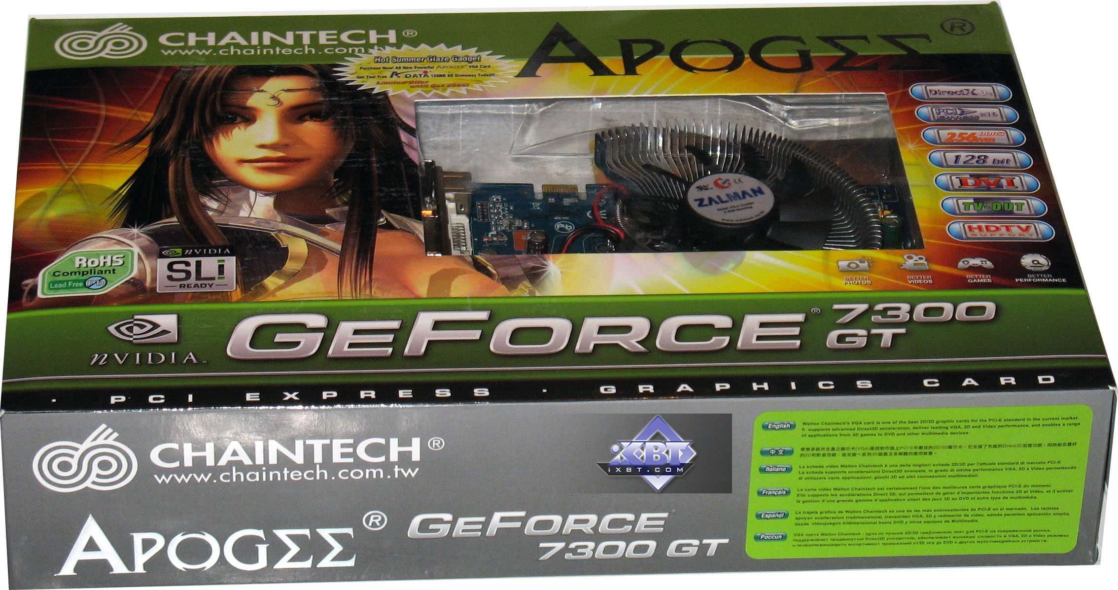 Chaintech Apogee Geforce 7300 GT 256MB PCI-E — отличный выбор для сравнительного недорогого акселератора, поддерживающего все современные новации (до DirectX 10, разумеется). Поднятые частоты позволяют этому продукту обгонять даже более дорогих соперников.