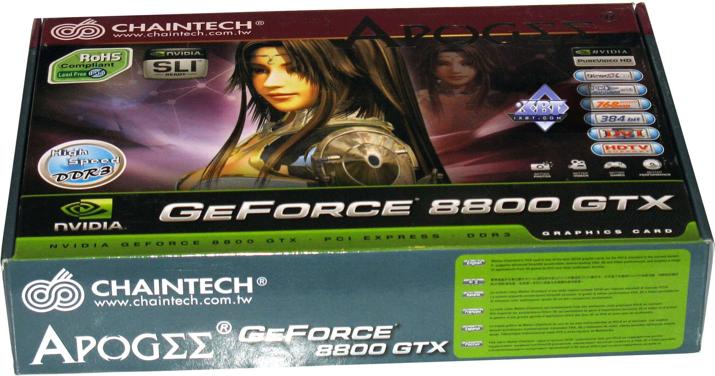 Chaintech Apogee Geforce 8800 GTX 768MB PCI-E - все, что сказано выше, применимо и к этому продукту. И добавим, что на сегодня это самый мощный в мире ускоритель трехмерной графики игрового класса. И, разумеется, самый дорогой. Надо еще раз отметить, что по состоянию на начало февраля есть нарекания на качество работы новой серии 8800 в ряде игр из-за сырости драйверов. Надеемся, что в ближайшее время это будет исправлено.
