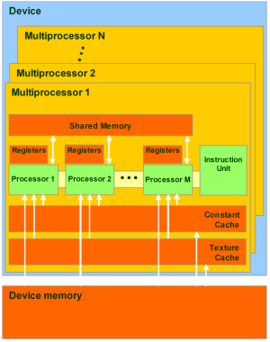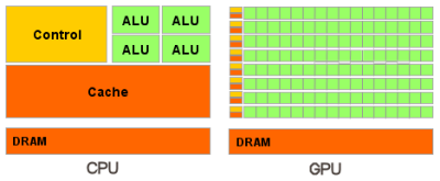 Например, в видеочипах Nvidia основной блок это мультипроцессор с восемью-десятью ядрами и сотнями ALU в целом, несколькими тысячами регистров и небольшим количеством разделяемой общей памяти. Кроме того, видеокарта содержит быструю глобальную память с доступом к ней всех мультипроцессоров, локальную память в каждом мультипроцессоре, а также специальную память для констант.