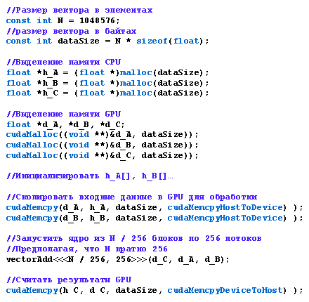 В качестве примера для понимания приведем CPU код для сложения векторов, представленный в CUDA: