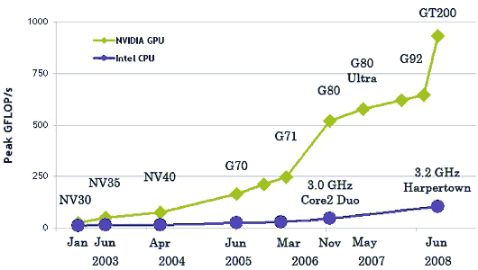 В результате всех описанных выше отличий, теоретическая производительность видеочипов значительно превосходит производительность CPU. Компания Nvidia приводит такой график роста производительности CPU и GPU за последние несколько лет: