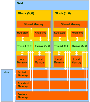 Естественно, что глобальная, локальная, текстурная и память констант — это физически одна и та же память, известная как локальная видеопамять видеокарты. Их отличия в различных алгоритмах кэширования и моделях доступа. Центральный процессор может обновлять и запрашивать только внешнюю память: глобальную, константную и текстурную.