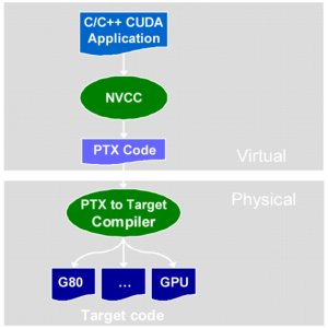 Файлы исходного кода на CUDA C компилируются при помощи программы NVCC, которая является оболочкой над другими инструментами, и вызывает их: cudacc, g++, cl и др. NVCC генерирует: код для центрального процессора, который компилируется вместе с остальными частями приложения, написанными на чистом Си, и объектный код PTX для видеочипа. Исполнимые файлы с кодом на CUDA в обязательном порядке требуют наличия библиотек CUDA runtime library (cudart) и CUDA core library (cuda).