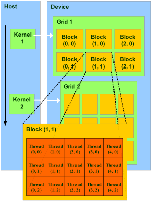 Повторимся, что CUDA использует параллельную модель вычислений, когда каждый из SIMD процессоров выполняет ту же инструкцию над разными элементами данных параллельно. GPU является вычислительным устройством, сопроцессором (device) для центрального процессора (host), обладающим собственной памятью и обрабатывающим параллельно большое количество потоков. Ядром (kernel) называется функция для GPU, исполняемая потоками (аналогия из 3D графики — шейдер).