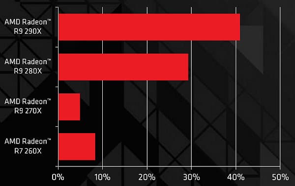 На этой диаграмме показан прирост производительности от применения Mantle, по сравнению с Direct3D-версией на системе с центральным процессором AMD A10-7700K. Причем, применяются игровые настройки ультра-качества, включено полноэкранное сглаживание уровня 4x MSAA, а разрешение применялось 1920×1080. В таких условиях прирост скорости на топовых моделях превышает 30-40%, ведь «раскрыться» в D3D-версии им мешает слабый CPU, а вот на решениях уровня рассматриваемой платы добавка FPS будет менее 10%. Впрочем, и это неплохо, ведь на данный момент Mantle поддерживается уже несколькими игровыми движками (в том числе Frostbite и CryEngine), десятком разработчиков, а количество игр, находящихся в разработке, равно нескольким десяткам.