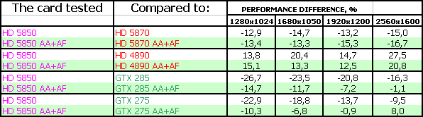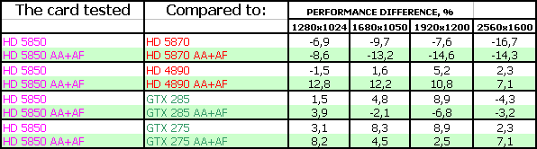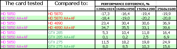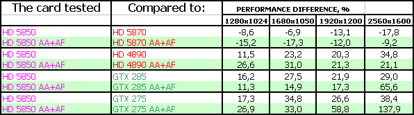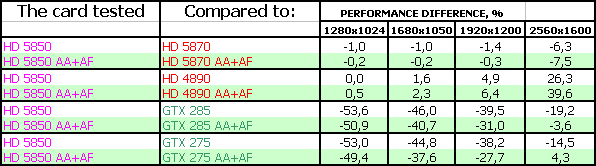 Вначале следует еще раз напомнить, что вся серия 5ххх поддерживает новый API DirectX 11, более качественную анизотропную фильтрацию, поддержку вывода изображения на три монитора (в т.ч. и в играх) и имеет иные достоинства, которые уже перечислялись в нашем базовом материале по Cypress. HD 5850 лишь несколько урезан по блокам относительно 5870, а потому менее производителен. И потому его прямой конкурент уже не GTX 285, а GTX 275. Наши тесты показали, что, несмотря на некоторые проигрыша, в целом успех у 5850 налицо в сравнении с GTX 275, да и против более дорогого GTX 285 выступает весьма неплохо (с учетом перспективности ускорителей, ведь все GTX-Карты поддерживают только DirectX 10).