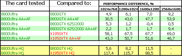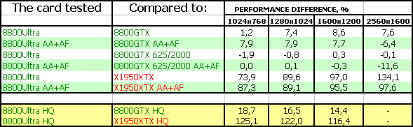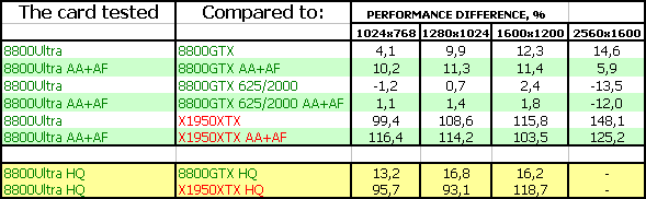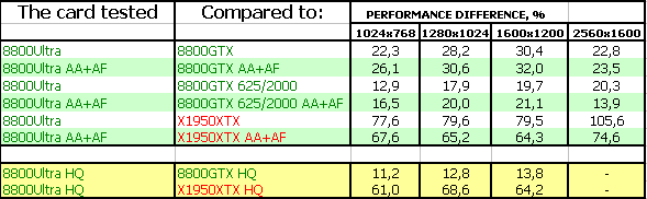 А этой игре более важны частоты и мощь блоков текстурирования и ROP, поэтому продукт EVGA оказался в лидерах. Но, тем не менее, в режиме HQ 8800 Ultra получил 15% перевеса над номинальным 8800 GTX.