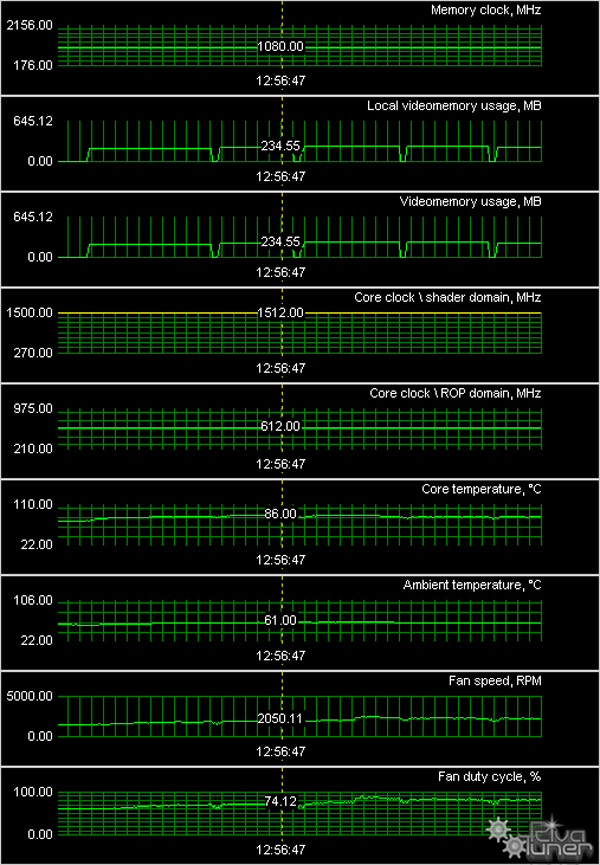 Мы провели исследование температурного режима с помощью утилиты RivaTuner (автор А.Николайчук AKA Unwinder) и получили следующие результаты: