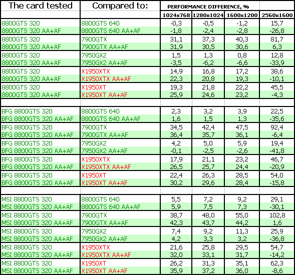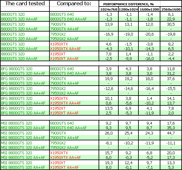 Отличия от 8800 GTS 640MB появились очень отчетливо только в крайне высоких разрешениях.