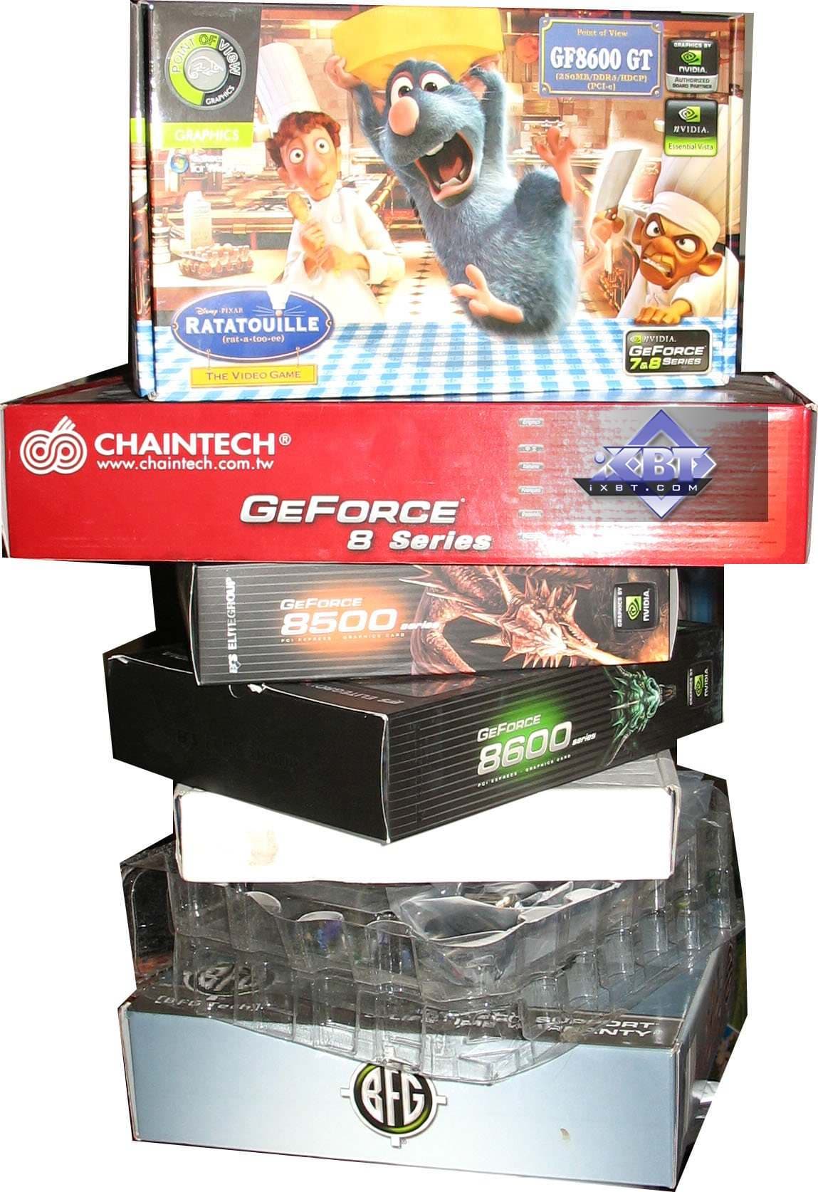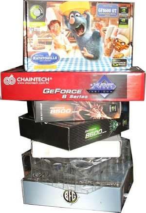 BFG Geforce 8600 GTS OC 256MB PCI-E, BFG Geforce 8600 GTS OC2 256MB PCI-E with ThermoIntelligence, Chaintech Geforce 8600 GT 256MB PCI-E, Chaintech Geforce 8600 GTS 256MB PCI-E, ECS/Elitegroup Geforce 8500 GT 512MB PCI-E, ECS/Elitegroup Geforce 8600 GT Plus Edition 256MB PCI-E, Point Of View Geforce 8600 GT Ratatouille Edition 256MB PCI-E
