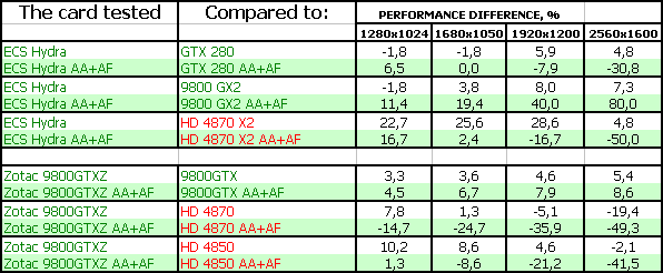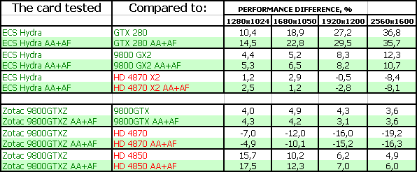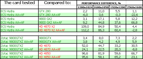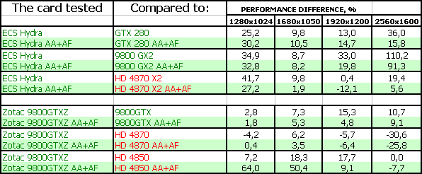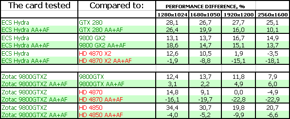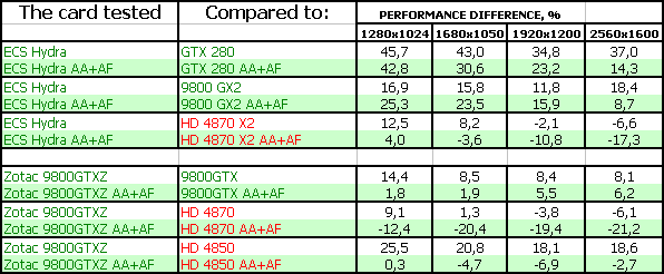 ECS Hydra 9800 GTX+ 2x512MB PCI-E — очень интересное решение для энтузиастов-любителей, а также для оверклокеров, которым такая мощная система охлаждения даст хороший потенциал для разгона. Если учитывать, что данный комплект видеокарт может работать только на Nvidia-платформах, то это почти самый быстрый на сегодня ускоритель при работе в SLI. Однако все минусы SLI-технологии (возможные рывки и сильные колебания мгновенного FPS при активном AFR-режиме работы SLI — когда каждая видеокарта обрабатывает свой кадр (четный и нечетный), а не делит экран на части) могут несколько подпортить целостную радужную картину, но об этом забывать все же нельзя. Трудно понять людей, которые убежденно и категорично хвалят двухпроцессорные конфигурации, будь они SLI или CrossFire (неважно). Потому как наши исследования наглядно показали, что только в играх с бенчмарками, под которые драйверы отлаживаются в первую очередь, может быть картина превосходной в плане скорости и мгновенного FPS. Когда же стоит запустить иные игры, так могут быть уже проблемы.