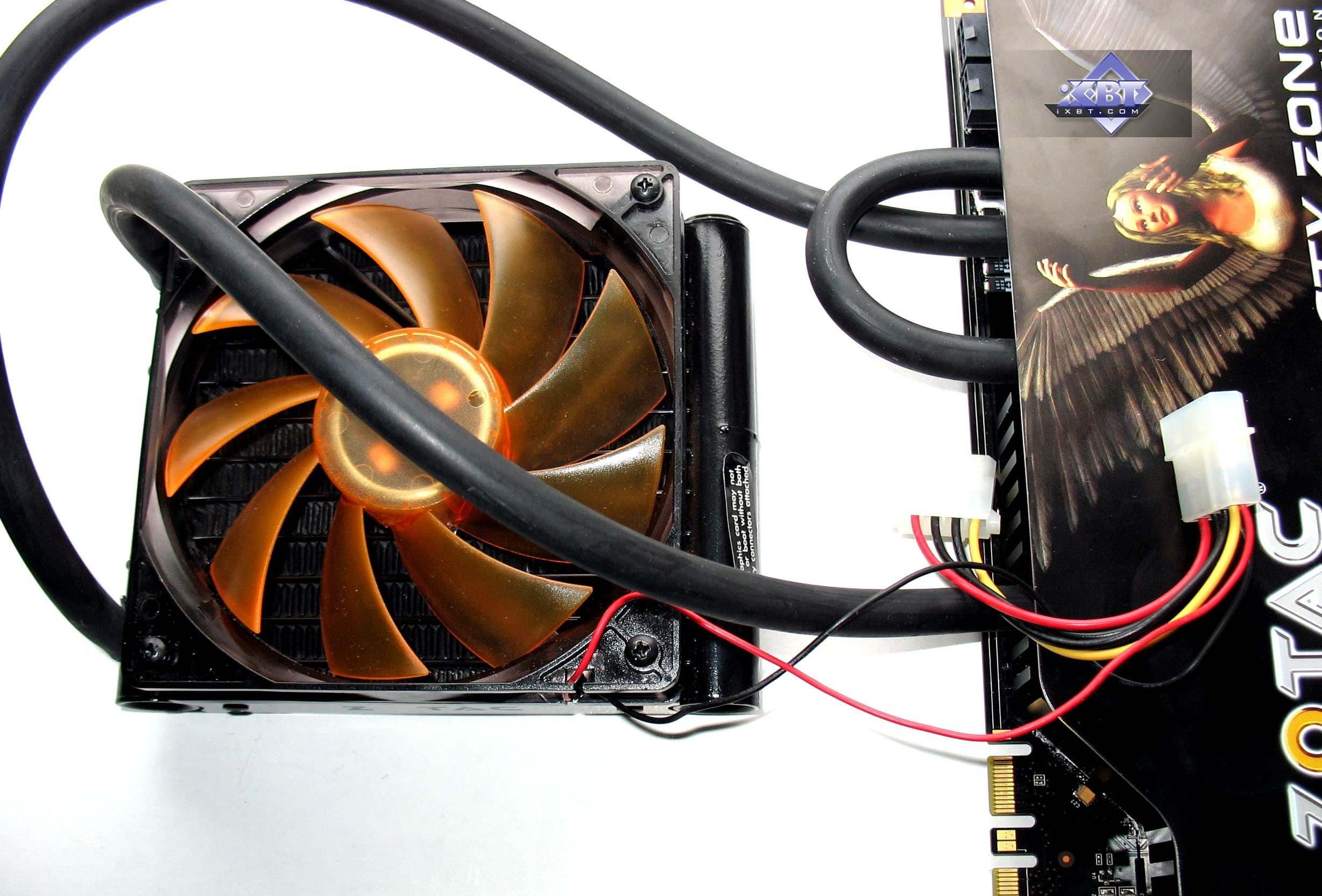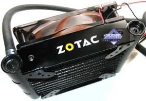 Продукт от Zotac имеет огромный модуль, установленный на карте, под его крышкой спрятан не только сам радиатор с приемом и выводом жидкости, но и помпа, гоняющая жидкость, а также емкость расширения для жидкости.