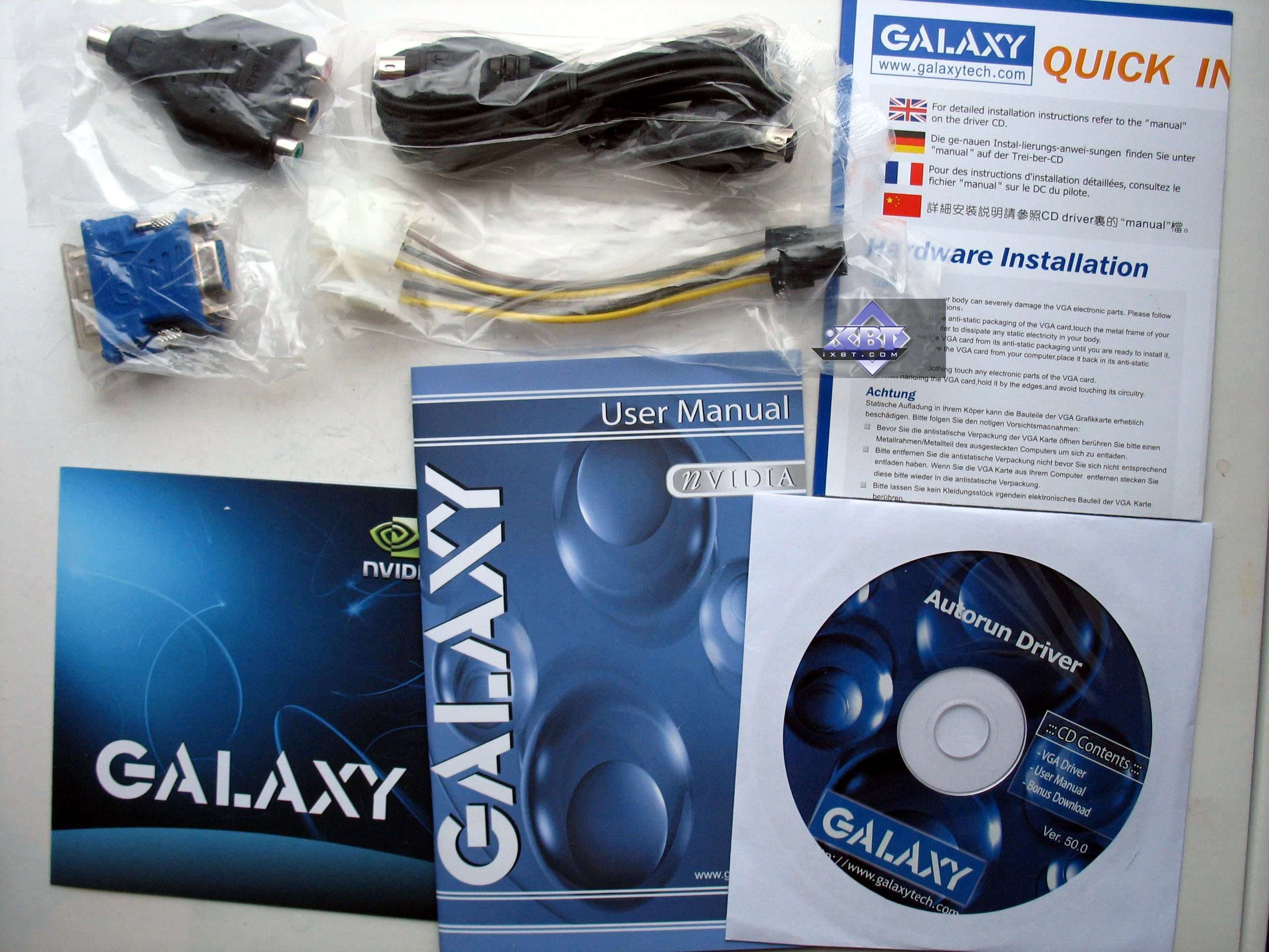 Напомним, что все эти карты требуют дополнительное питание, поэтому с каждой платой поставляются переходники с молекс на 6-пиновый разъем, хотя уже все современные БП имеют такие «хвосты». Отмечу особо, что продукт от Galaxy имеет ДВА гнезда для питания, что позволяет увеличить стабильность работы карты при разгоне.