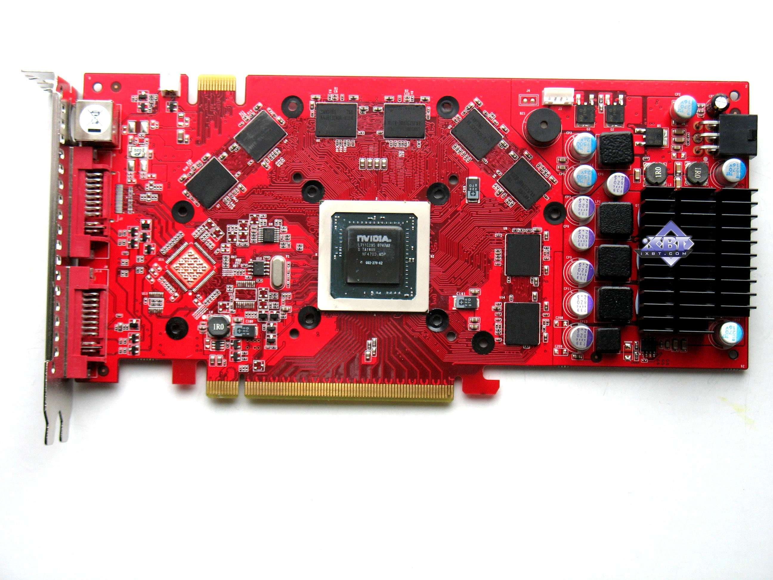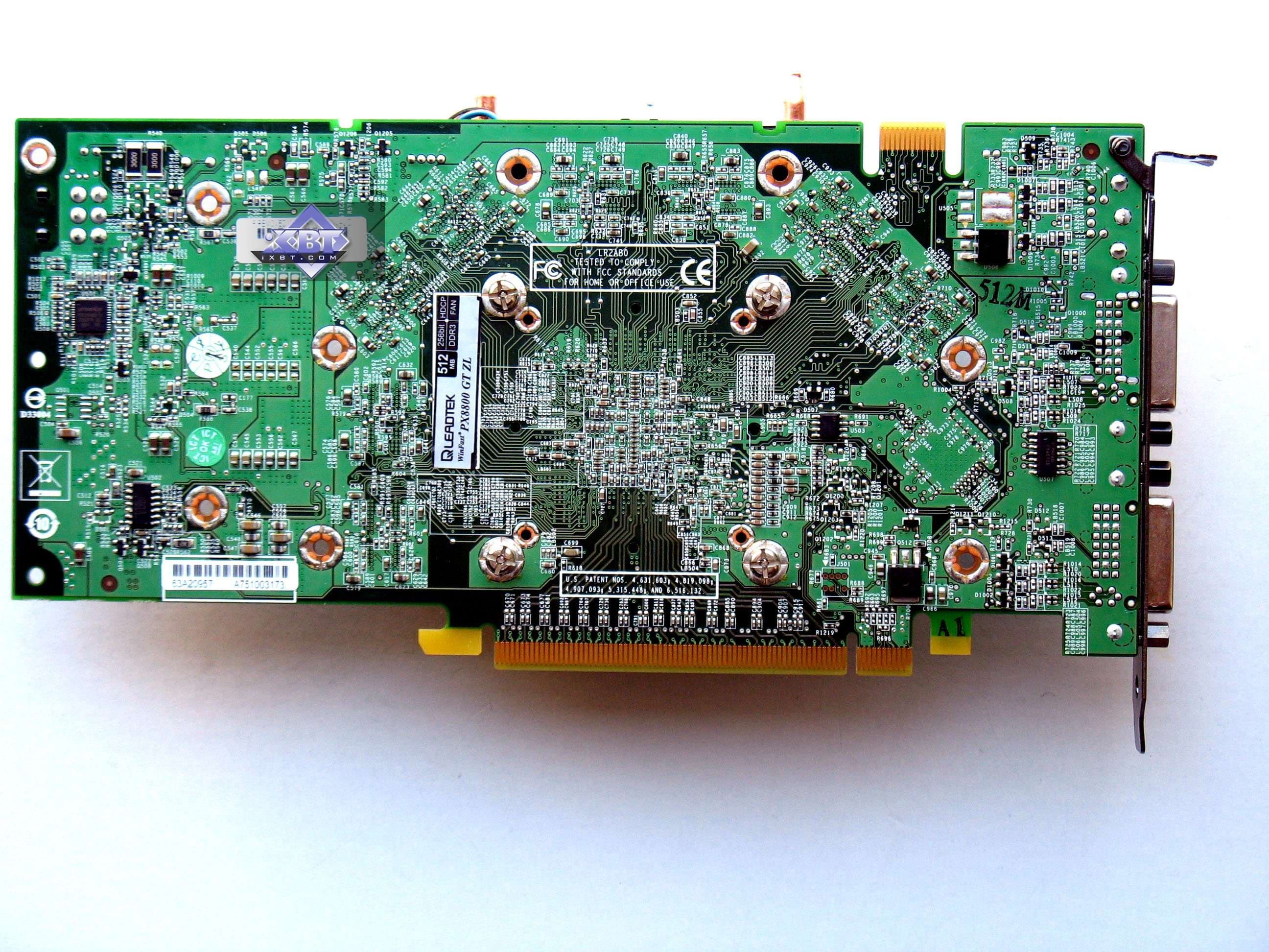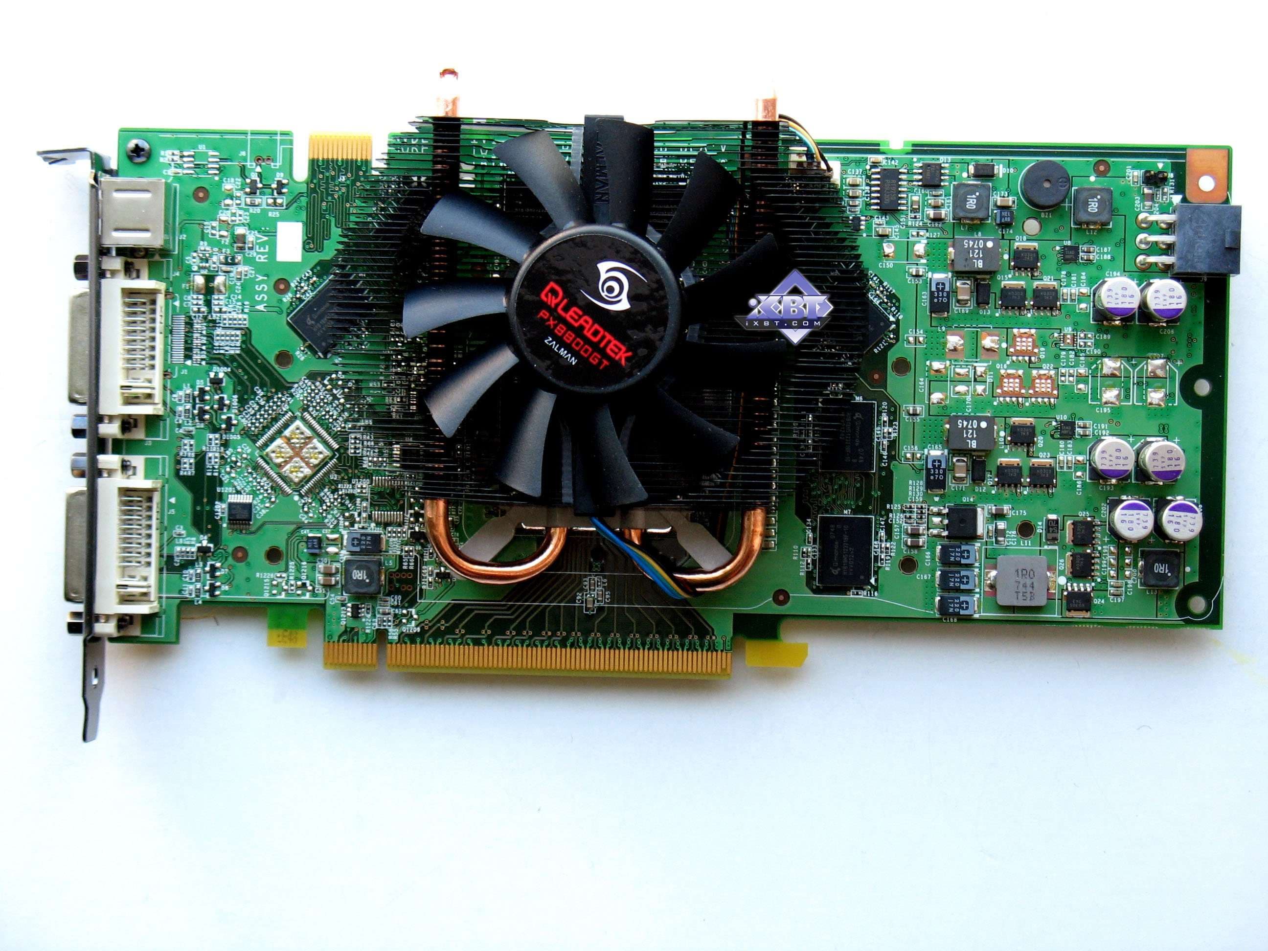 А вот остальные акселераторы имеют в какой-то степени вмешательство производителей. Карта от Galaxy — вообще уникального дизайна, имеет джампер для увеличения напряжения на ядре, что позволяет усилить оверклокерский потенциал карты. Продукты Leadtek, Gigabyte, Gainward, Palit имеют уникальные системы охлаждения, вместе с тем карта от Gainward несет на себе аж целый гигабайт памяти, что не могло не сказаться в разводке PCB.