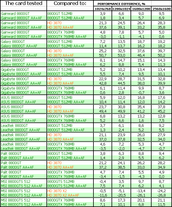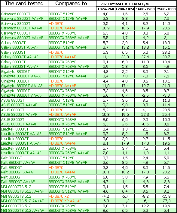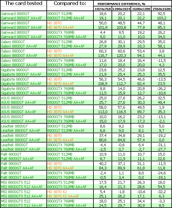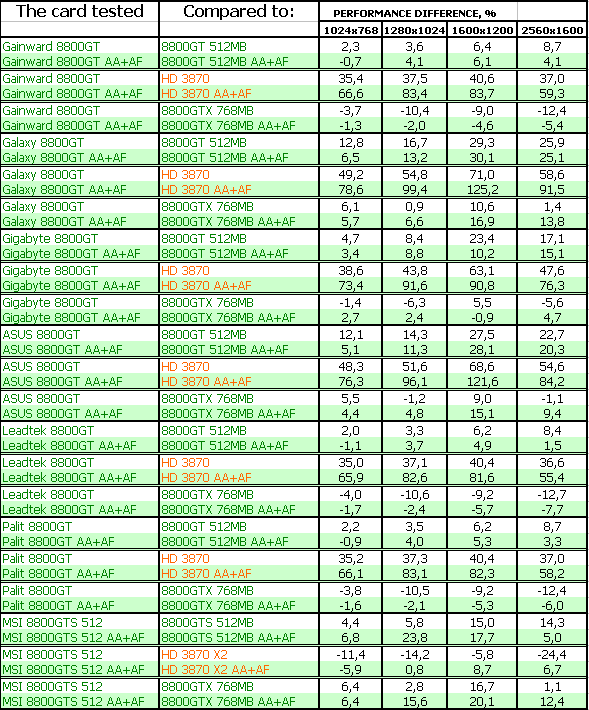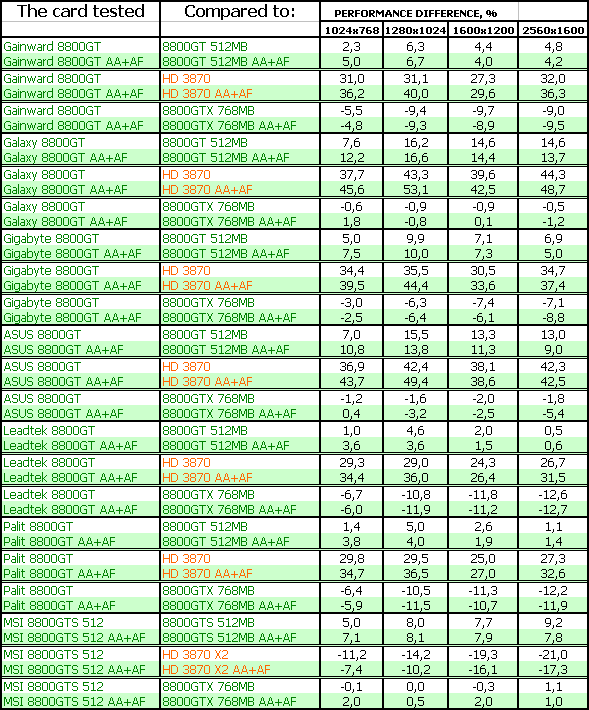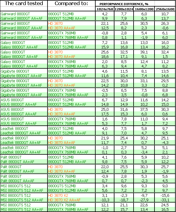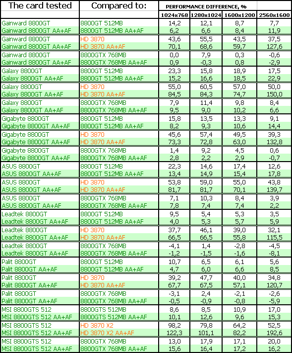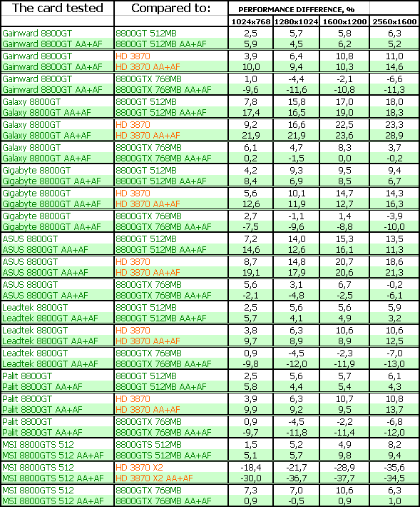 Результаты тестирования ярко показали, что большинство рассмотренных карт 8800 GT мало отличаются друг от друга по скорости, однако наиболее разогнанные изделия показали очень хорошие результаты в CRYSIS, в этаком современном эталоне измерения потенциала трехмерных ускорителей. В ряде тестов указанные платы демонстрировали даже обход по скорости более дорогого 8800 GTX. Понятно, что все 8800 GT сильно обходят в производительности конкурента от AMD в лице RADEON HD 3870.