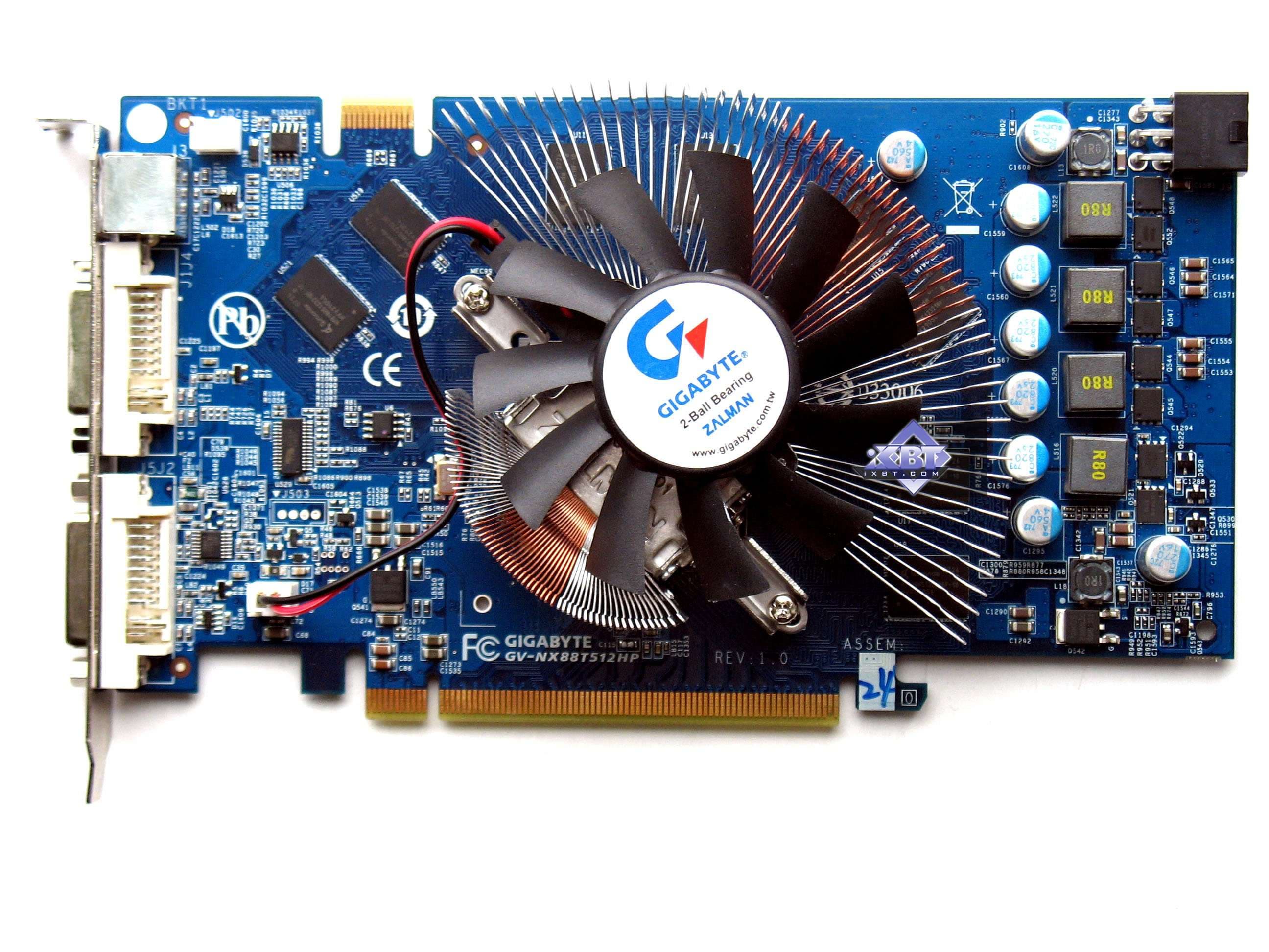 Gigabyte Geforce 8800 GT Zalman Edition 512MB PCI-E — данный продукт произведен самой компанией Gigabyte, хоть и является копией эталонного дизайна. Установка эффективной и тихой системы охлаждения от Zalman позволила хорошо поднять частоты работы карты и при этом нет проблем с перегревом. Поскольку упаковки и комплекта у нас не было, окончательную оценку продукту дать не могу.