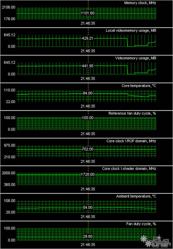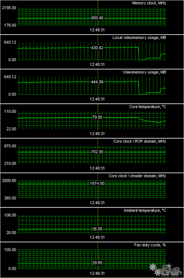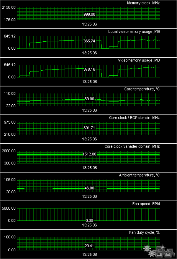 Мы провели исследование температурного режима с помощью утилиты RivaTuner (автор А.Николайчук AKA Unwinder) и получили следующие результаты: