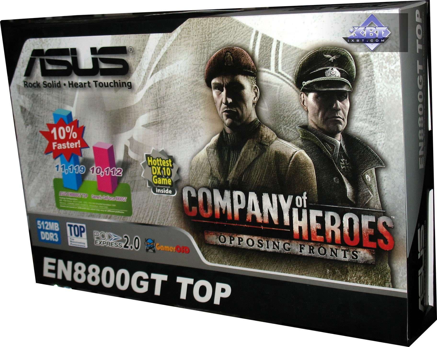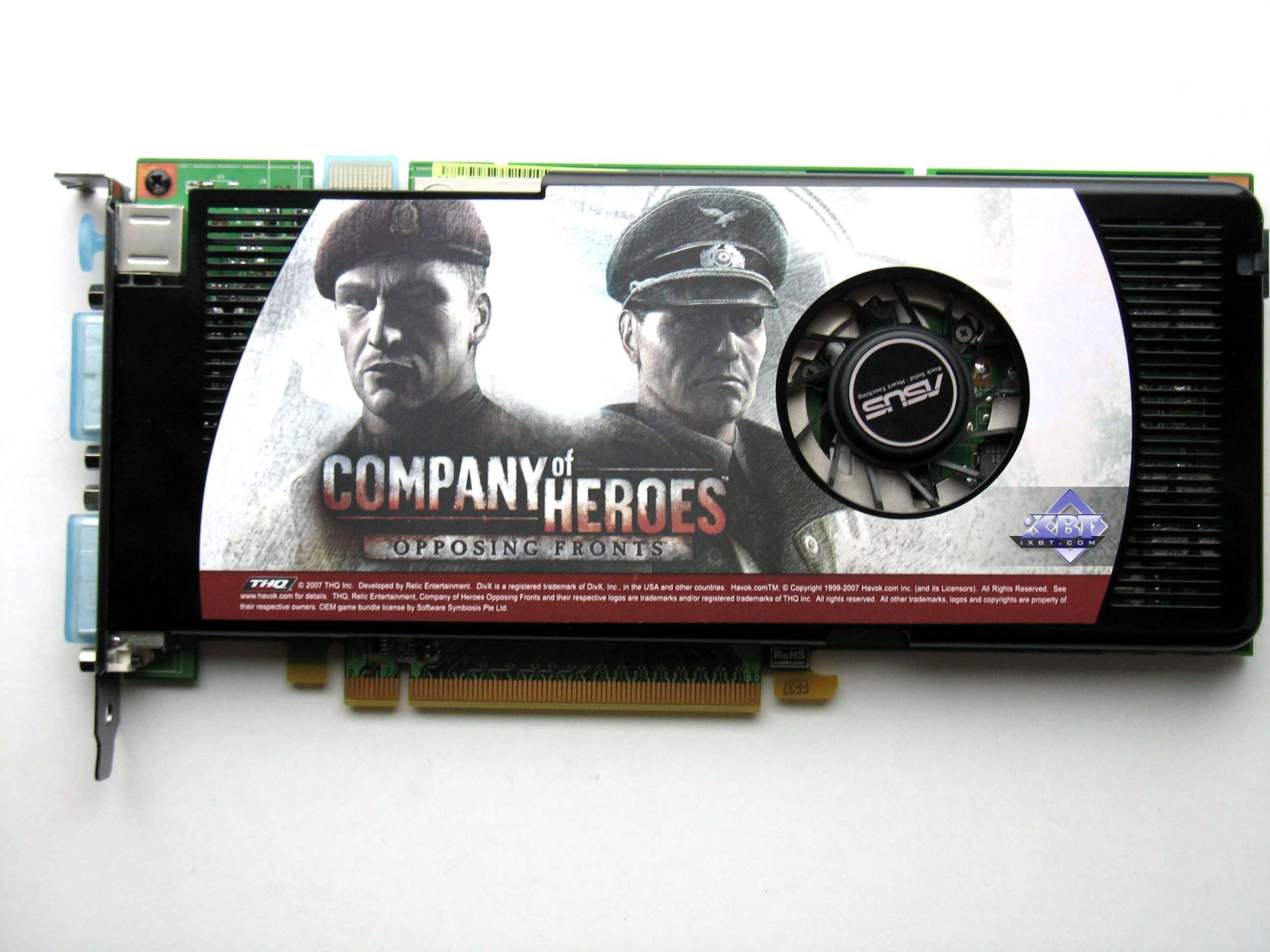 Asus Geforce 8800 GT TOP 512MB PCI-E — станадартная эталонная карта, работающая на повышенных частотах. Поэтому все минусы, присущие референс-кулеру, есть и в данном случае: шум и не очень высокая эффективность охлаждения. Подчеркну особо для поклонников этой компании и марки, что видеокарта произведена не Asus, а по заказу Nvidia на стороннем заводе, как и все референс-карты. Имеется бонус — современная игра и кожаный кошелек для дисков.
