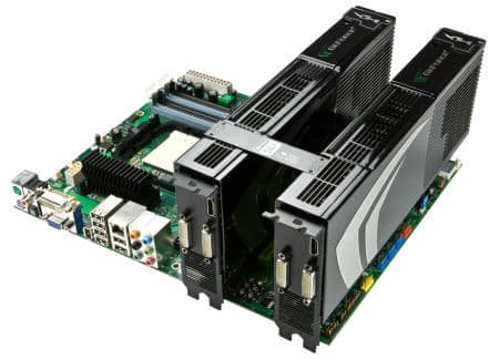 Кроме того, что Geforce 9800 GX2 сам является двухчиповой SLI системой, новые возможности технологии Quad SLI позволяют объединять две такие платы в одной системной плате с поддержкой SLI. Подобной поддержкой обладают системные платы на основе чипсетов Nvidia nForce 680i, 780i и 780a.
