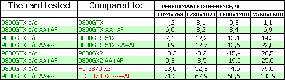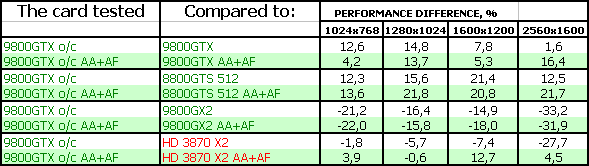 Как мы видим, разгон принес 9800 GTX очень хорошие дивиденды, хотя это касается, конечно, прежде всего, очень тяжелых игр. Тесты показали, то уровень 8800 Ultra если и не полностью достигнут, то показатели уже рядом, учитывая цену 9800 GTX, это неплохая замена старому продукту (хотя не будем забывать, что остатки 8800 Ultra пока еще можно найти по бросовым ценам, однако если их уже нет, то выбор за 9800 GTX).