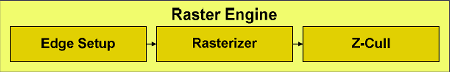 Движок растеризации выполняет три стадии конвейера. В стадии установки граней (edge setup) производится выборка положения вершин и вычисляются проекции граней треугольника. Треугольники, обращённые к экрану обратной стороной, отбрасываются как невидимые (back face culling). Каждый из блоков установки граней обрабатывает по одной точке, линии или треугольника за такт.