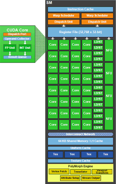 Всего в состав GF100 входит 512 потоковых процессоров, так называемых CUDA cores, собранных в 16 мультипроцессоров по 32 штуки в каждом. Каждый SM поддерживает одновременное выполнение до 48 варпов, а CUDA core может выполнять все типы программ: вершинные, пиксельные, геометрические, вычислительные.