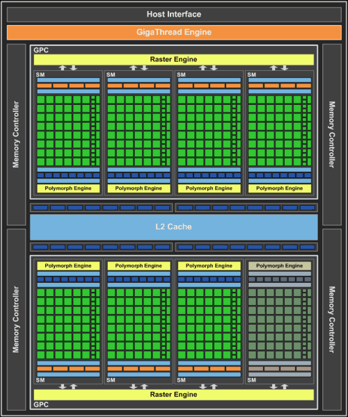 Новый GPU в своем полном представлении (которое пока что не вышло на рынок, т.к. GTX 460 урезан по количеству ALU и TMU) содержит внешний интерфейс PCI Express, движок GigaThread, два GPC, по четыре контроллера памяти и укрупненных блоков ROP, а также 384 или 512 КБ (в зависимости от ширины шины и объёма видеопамяти) кэш-памяти второго уровня, присоединённые к блокам ROP.