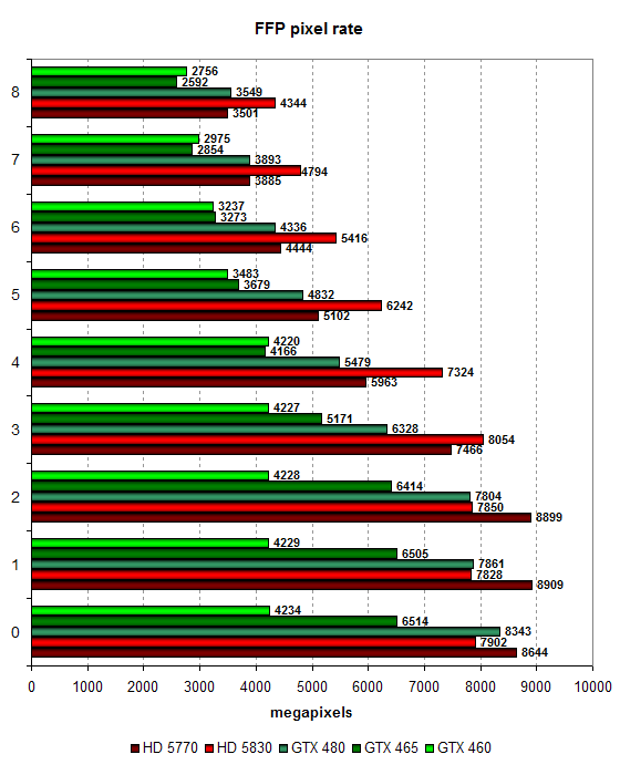Интересна разница между GTX 460 и GTX 465. В случаях с небольшим количеством текстур, где больше сказывается ограничение по ПСП, выигрывает вариант на основе урезанного GF100, обладающий большей ПСП. Зато при 4-8 текстурах GTX 460 догоняет и даже опережает GTX 465. Впрочем, в этом тесте в любом случае явно не достигаются реально возможные показатели нового GPU. Смотрим эти же результаты в тесте филлрейта: