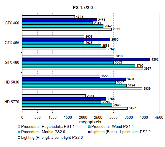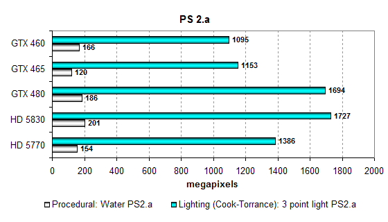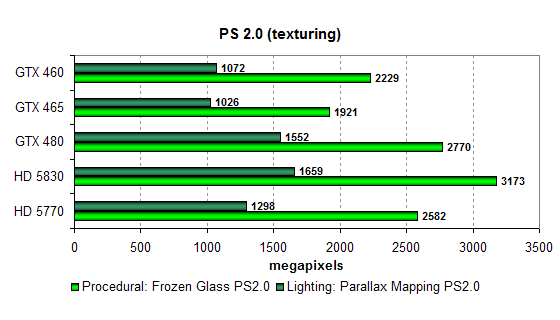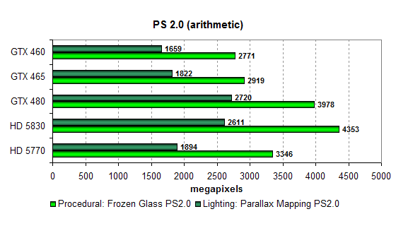 И действительно, положение GTX 460 немного улучшилось. Хотя эта видеокарта продолжает уступать и HD 5830 и HD 5770 (с текстурными выборками в нашей DX9 синтетике карты AMD справляются явно лучше), но хотя бы слабую по текстурированию GTX 465 она обходит, особенно в тесте Frozen Glass, больше зависящем от производительности TMU. Сегодняшний герой в лице GTX 460 выглядит лучше, подбираясь к гораздо более дорогой GTX 480, так как в этих тестах явно заметен упор производительности в скорость текстурных блоков, а и их количество у GF100 всё же недостаточное.