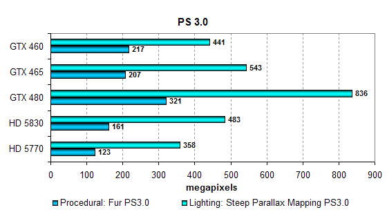 Если сравнивать с видеокартами AMD, то можно вздохнуть с облегчением с тестами пиксельных шейдеров версии 3.0 у решений Nvidia всё совсем неплохо! Оба PS 3.0 теста довольно сложные, почти не зависят от ПСП и текстурирования, и они чисто математические, но с большим количеством переходов и ветвлений, с которыми лучше справляется новая архитектура Nvidia.