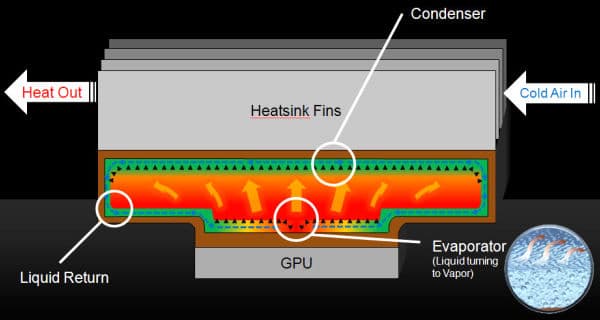 Пониженное энергопотребление и модифицированный кулер, работающий более эффективно, должны привести к снижению шума. Новая система охлаждения использует технологию испарительной камеры, известную по оригинальным системам охлаждения некоторых производителей. Медная испарительная камера отбирает тепло у GPU, которое затем рассеивается при помощи большого двухслотового радиатора. В конструкции применяется вентилятор цилиндрического типа, он засасывает прохладный воздух изнутри корпуса и выбрасывает нагретый наружу.