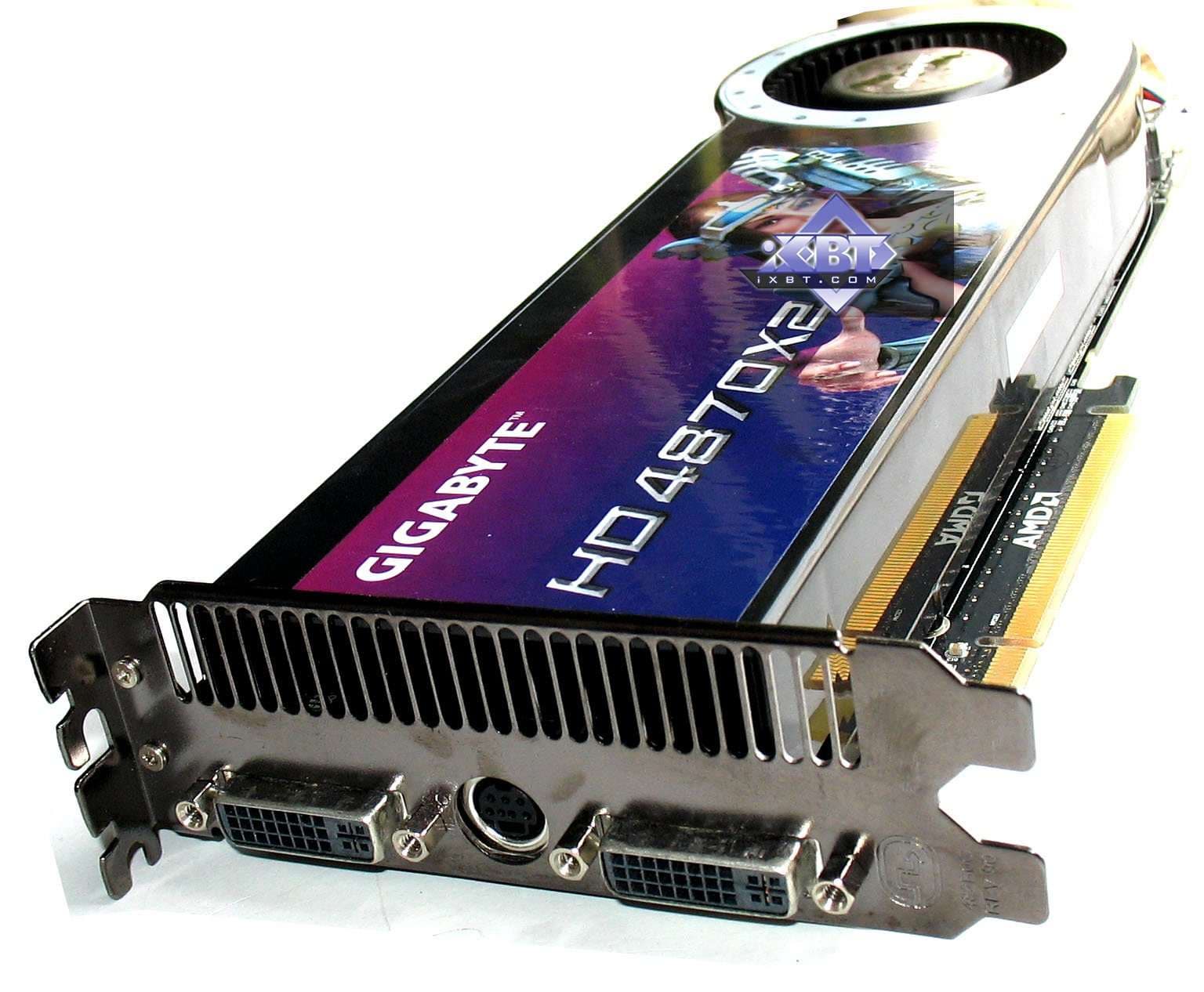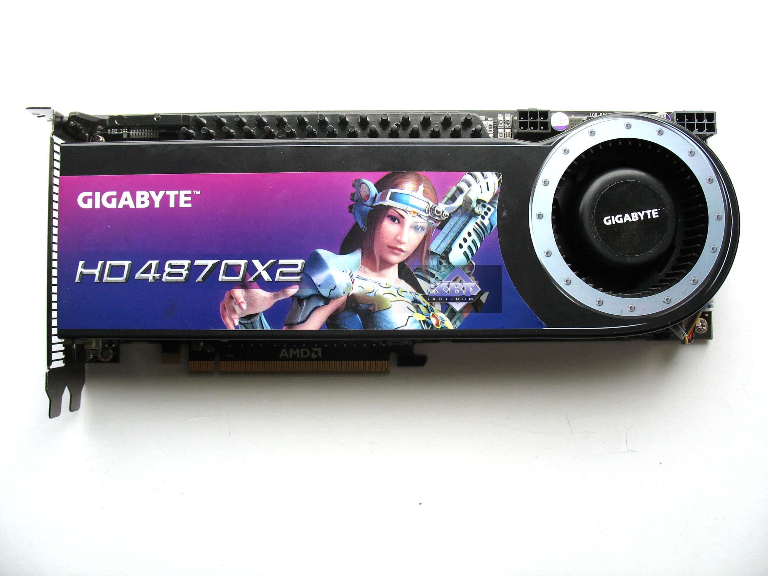 Gigabyte RADEON HD 4870 X2 2x1024MB PCI-E — стандартный Х2, копия эталонной карты, больше сказать нечего. Смотрите цены и делайте свой выбор между референсными 4870 Х2.