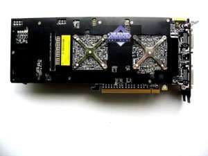 | Карта имеет 2x1024 МБ памяти GDDR5 SDRAM, размещенной в 16 микросхемах (по 8 на лицевой и оборотной сторонах PCB) Микросхемы памяти Hynix (GDDR5). Микросхемы рассчитаны на максимальную частоту работы в 1000 (4000) МГц. | ![]() |