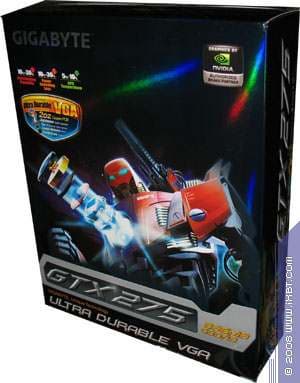 Gigabyte Geforce GTX 275 Durable 896MB PCI-E — также, на мой взгляд, лучший из GTX 275 со стандартными частотами на сегодня. Понятно, что уже есть на рынке и всякого рода турбо-версии, но среди карт, работающих на нормальных штатных частотах, это изделие имеет ряд плюсов, связанных с переработанной PCB: меньший нагрев, меньшее энергопотребление, меньшая скорость вращения кулера. А также имеется TV-out, чего уже почти не встретить на референс-продуктах GTX 2xx класса.