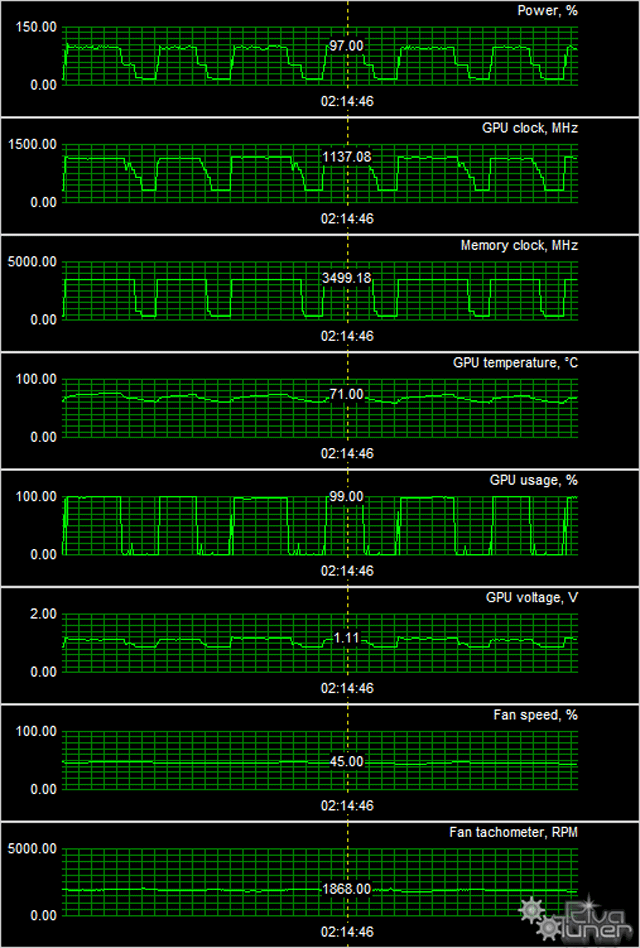 Мы провели исследование температурного режима с помощью утилиты EVGA PrecisionX (автор А. Николайчук AKA Unwinder) и получили следующие результаты: