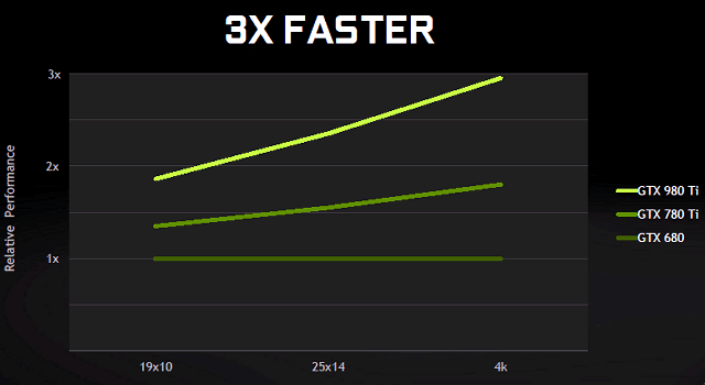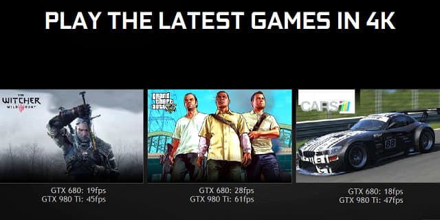По оценке компании Nvidia, по средней частоте кадров в самых современных играх, включая Witcher 3, Assassin's Creed: Unity, Grand Theft Auto: IV, Far Cry 4, Dragon Age: Inquisition, Shadow of Mordor и Watch Dogs, запущенных на топовой системе с высокими игровыми настройками в разных разрешениях, представленная сегодня модель Geforce GTX 980 Ti от двух до трех раз быстрее, чем Geforce GTX 680 (максимальная разница наблюдается в разрешении 4K, разумеется), а предшественница GTX 780 Ti обойдена в среднем в полтора раза. Приводит Nvidia и конкретные примеры игр, протестированных в самом высоком разрешении:
