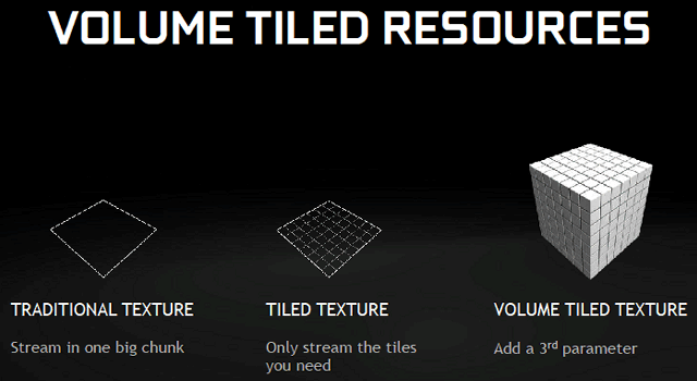 Дополнительно, все графические чипы семейства GM2xx поддерживают объемные тайловые ресурсы (volume tiled resources), схожие по типу с просто тайловыми, но в трехмерном виде. Принцип работы тайловых ресурсов состоит в разделении текстур на тайлы, а в процессе рендеринга приложение определяет и загружает в видеопамять лишь те тайлы, которые нужны для визуализации. Эта возможность позволяет игровым разработчикам получать более разнообразные текстуры на объектах в сцене при меньшем использовании видеопамяти, а также помогает в организации текстурного стриминга.