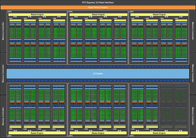 На сегодняшний день, GM200 — это самый мощный GPU как у Nvidia, так и вообще на рынке. Архитектурно видеочип GM200 полностью соответствует младшей модели GM204, он также состоит из кластеров GPC, в которые собрано по несколько мультипроцессоров SM. Графический процессор содержит шесть кластеров GPC, состоящих из 24 мультипроцессоров, но в данной модели были отключены два из них — в основном, чтобы Titan X оказалась все же немного быстрее, оправдывая свои название и цену.