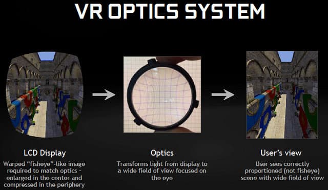 К примеру, можно взять различные оптимизации рендеринга. Общеизвестно, что VR-устройства используют в работе специальную оптическую систему из экрана высокого разрешения и линз, установленных перед ними в нескольких сантиметрах. Эти самые линзы и создают ощущение виртуальной реальности, обеспечивая соответствующий сверхширокий обзор с большим полем зрения.