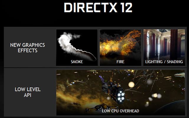Компания Microsoft в своих материалах в основном рассказывает о внесенных в новую версию графического API оптимизациях производительности — Direct3D 12 позволяет меньше грузить CPU бесполезной работой, удобно контролировать использование ресурсов GPU, что раньше делалось операционной системой и видеодрайвером, а графический код можно лучше распараллелить на несколько вычислительных устройств. Все это позволяет значительно повысить производительность, особенно в условиях, когда она ограничена большим количеством вызовов функций отрисовки (draw calls). Что даже еще более важно, эти возможности поддерживаются на всех видеокартах Geforce, начиная с GTX 400.