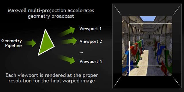 В случае с виртуальной реальностью, технология работает так — картинка делится на несколько областей (viewport) и каждая из них отрисовывается в разных разрешениях, в зависимости от расположения. Так, разрешение центральной области остается без изменений, а боковые области масштабируются в зависимости от требуемого качества. На обычных GPU без поддержки мультипроецирования, потребовалось бы несколько раз отрисовать одну и ту же геометрию в несколько буферов, а эта возможность позволяет за один проход спроецировать геометрию сразу в несколько буферов.