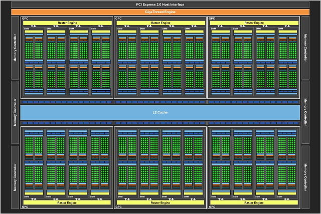 Такое решение далось для Kepler нелегко — уж слишком большая часть площади этого чипа была занята FP64-ядрами CUDA и другими специализированными блоками для вычислений. В случае большого Maxwell было решено обойтись графическими задачами и его сделали просто в виде укрупнённой версии GM204. Новый чип GM200 стал чисто графическим, в нём нет специальных блоков для FP64-вычислений, и их темп остался прежним — лишь 1/32 от FP32. Зато большая часть площади GK110, занятая FP64 ALU, освободилась и на их место было помещено большее количество важных для графики FP32 ALU.