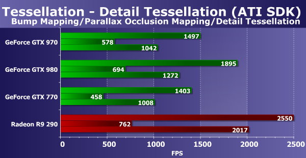 Мы тестируем все видеоплаты при четырех разных коэффициентах тесселяции — в данном случае настройка называется Dynamic Tessellation LOD. При первом коэффициенте разбиения треугольников, скорость не ограничена производительностью геометрических блоков, и видеокарта Radeon R9 290 показывает высокий результат, даже превосходящий скорость анонсированной недавно платы Geforce GTX 970, но уже на следующих ступенях геометрической нагрузки производительность платы Radeon снижается весьма серьёзно, и новинка Nvidia выходит вперёд.