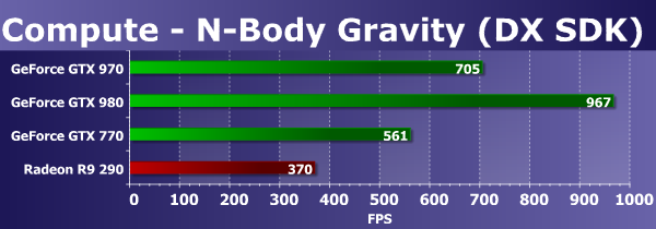 В изменившихся условиях новая видеокарта Geforce GTX 970 также опережает аналогичную модель из предыдущего поколения — GTX 770, оказываясь между последней и GTX 980. От своего более производительного собрата на GM204 она отстаёт на 15-18%, а отставание от главного ценового конкурента в виде Radeon R9 290 лишь увеличилось — в подобных вычислениях чипы компании AMD явно сильны, так как они предпочитают попиксельные вычисления.