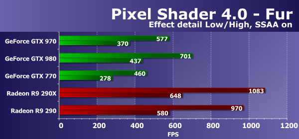 Оба графических решения AMD Radeon и в этом D3D10-тесте пиксельных шейдеров работают явно эффективнее, по сравнению с конкурирующими платами Geforce, но новый чип GM204 слегка изменил ситуацию в лучшую сторону — представленная ранее вторая из топовых плат Geforce GTX 970 на втором чипе архитектуры Maxwell стала заметно быстрее предшествующей Geforce GTX 770 и в самых сложных условиях отстаёт от соперничающей с ней Radeon R9 290 лишь на 10%.
