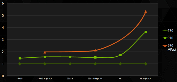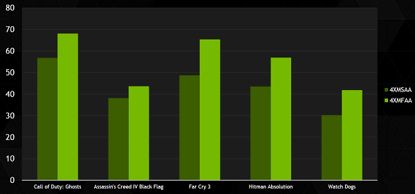 По сравнению с Geforce GTX 670, которая является одной из самых популярных топовых видеокарт в современных ПК-системах, новая модель этого же уровня обеспечивает приличный прирост производительности около полутора раз, а в сверхвысоких разрешениях и того больше. А уж если учитывать новый алгоритм полноэкранного сглаживания MFAA, то она и вовсе минимум вдвое лучше, если верить графикам Nvidia.