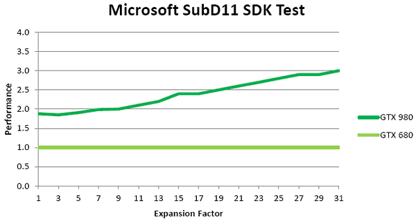 Тесселяция является одной из самых важных особенностей DirectX 11 и геометрическая производительность будет играть важную роль в будущих игровых проектах, изначально предназначенных для консолей текущего поколения и современных ПК. В самых простых условиях новый GM204 обрабатывает геометрию вдвое быстрее, чем GK104, а в сложных его преимущество доходит до трехкратного:
